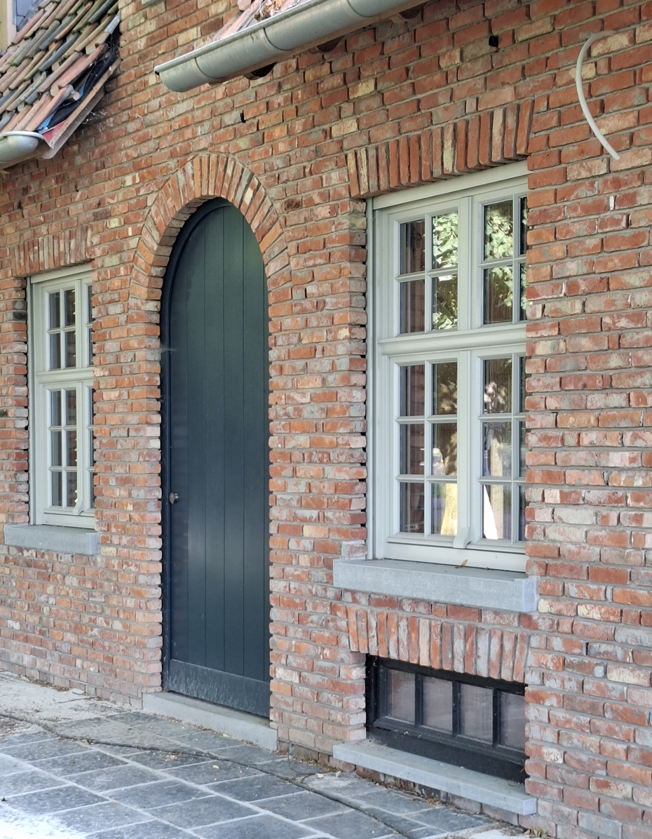 Het interieur combineert traditionele en moderne elementen. Het zichtbare spant en een gerecupereerde balk geven de woning karakter en verwijzen naar de oorspronkelijke structuur. De gevel wordt gekaleid en afgewerkt met een combinatie van rode en blauwe Boomse pannen, wat zorgt voor een tijdloze en authentieke uitstraling.