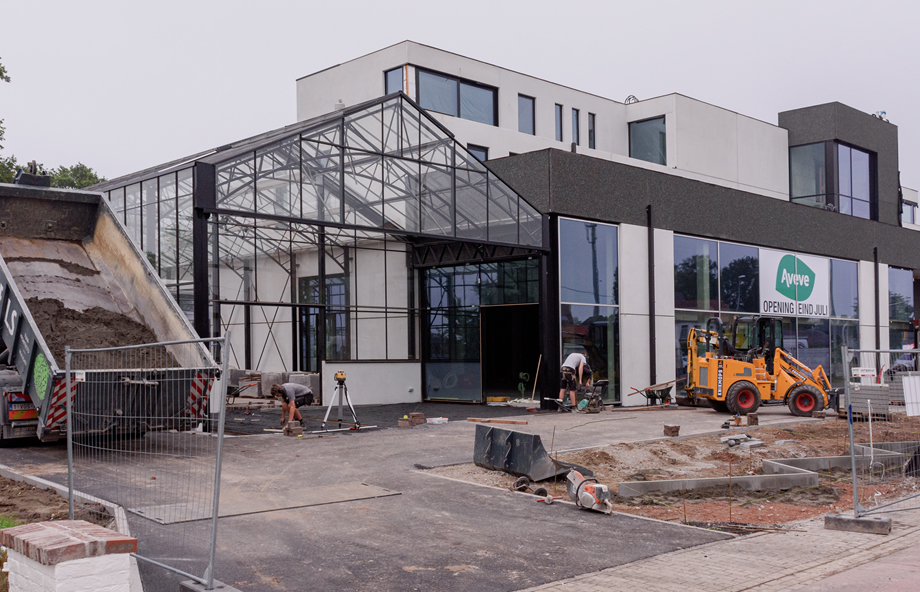 Met de sloop van twee vrijstaande villa’s wordt er plaats gemaakt voor een Aveve met nieuw concept. De komst van belevingswinkels bij Aveve vroeg om een nieuwe locatie langs de N9 in Waarschoot. Een volume met dubbele hoogte en mezzanine voor de winkel met erboven appartementen. Een centrale liftkoker verdeelt het beeld in twee.